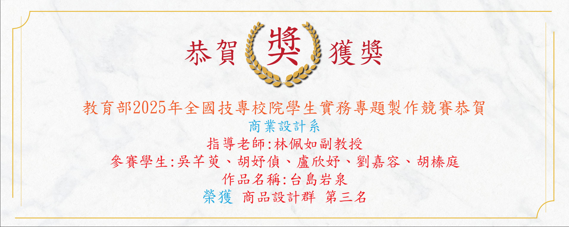 教育部2025年全國技專校院學生實務專題製作競賽 恭賀商業設計系 作品名稱:台島岩泉 榮獲 商品設計群 第三名