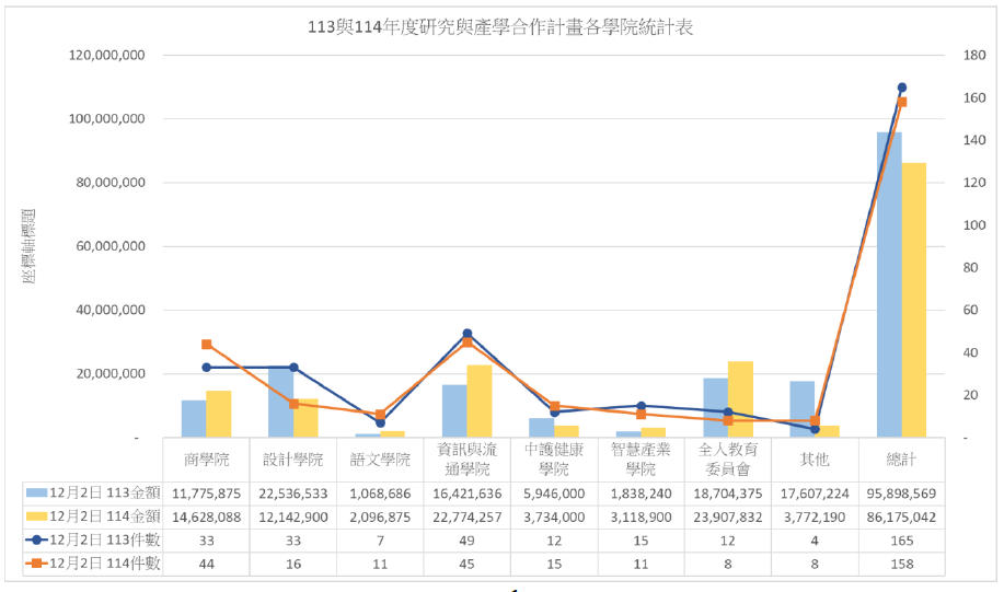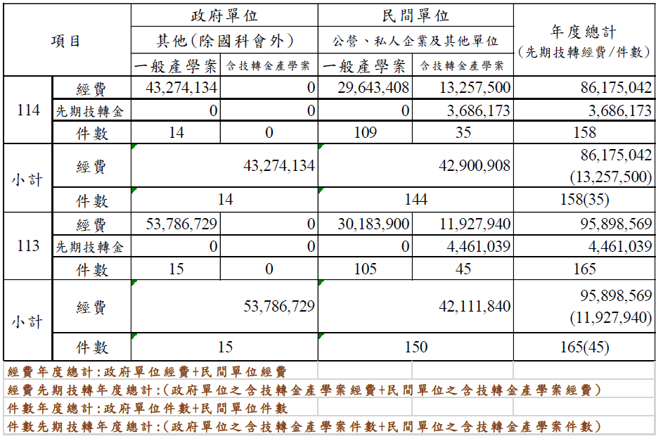 本校114年度研究及產學合作計畫(截至114/12/01止)共計158件,總經費新台幣(下同)86,175,042元整,含(先期)技術移轉35件,金額$13,257,500元整; 113年度同期研究及產學合作計畫(截至113/12/01止)共計165件,總經費新台幣(下同)95,898,569元整,含(先期)技術移轉45件,金額$11,927,940元整。