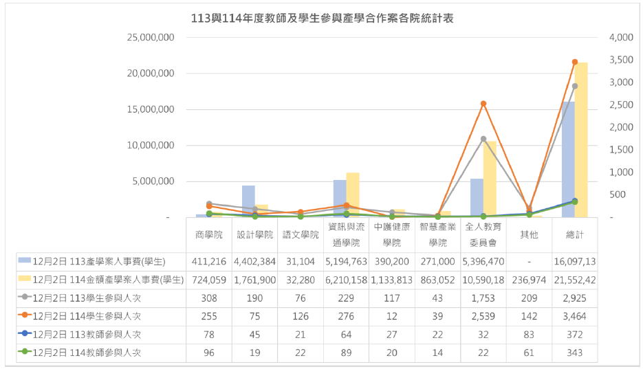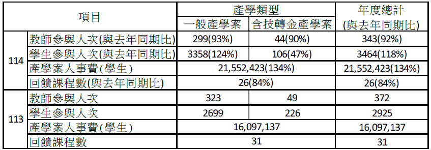 114年度教師及學生參與產學合作案參與人次、聘任學生經費及回饋課程數(截至114/12/01止) ,參與之情形如下表所示: