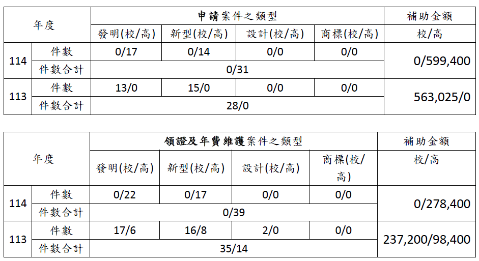 本校 114 年度共計補助師生專利申請(截至114/12/01止),申請件數共計31 件(17件發明,14件新型),高教深耕計畫辦公室補助金額599,400元。領證及年費維護計39件(22件發明、17件新型) ,高教深耕計畫辦公室補助金額278,400元。