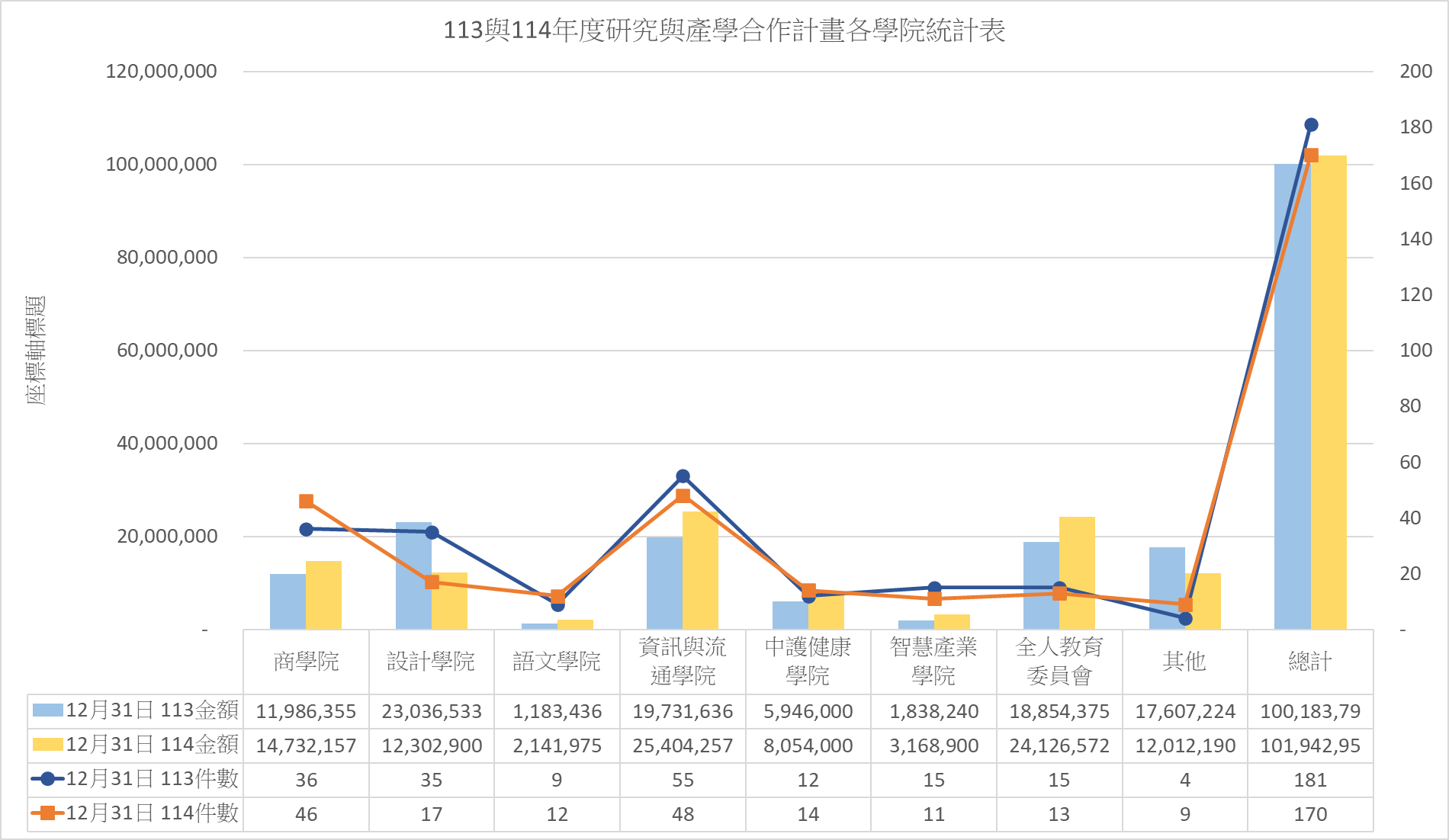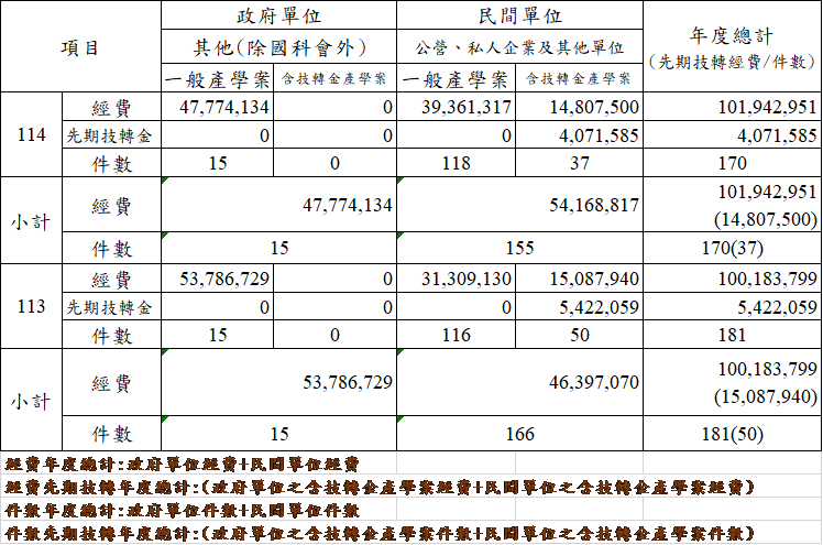 本校114年度研究及產學合作計畫(截至114/12/31止)共計170件,總經費新台幣(下同)101,942,951元整,含(先期)技術移轉37件,金額$14,807,500元整; 113年度同期研究及產學合作計畫(截至113/12/31止)共計181件,總經費新台幣(下同)100,183,799元整,含(先期)技術移轉50件,金額$15,087,940元整。