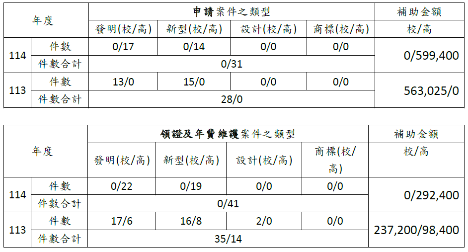 本校 114 年度共計補助師生專利申請(截至114/12/31止),申請件數共計31 件(17件發明,14件新型),高教深耕計畫辦公室補助金額599,400元。領證及年費維護計41件(22件發明、19件新型) ,高教深耕計畫辦公室補助金額292,400元。
