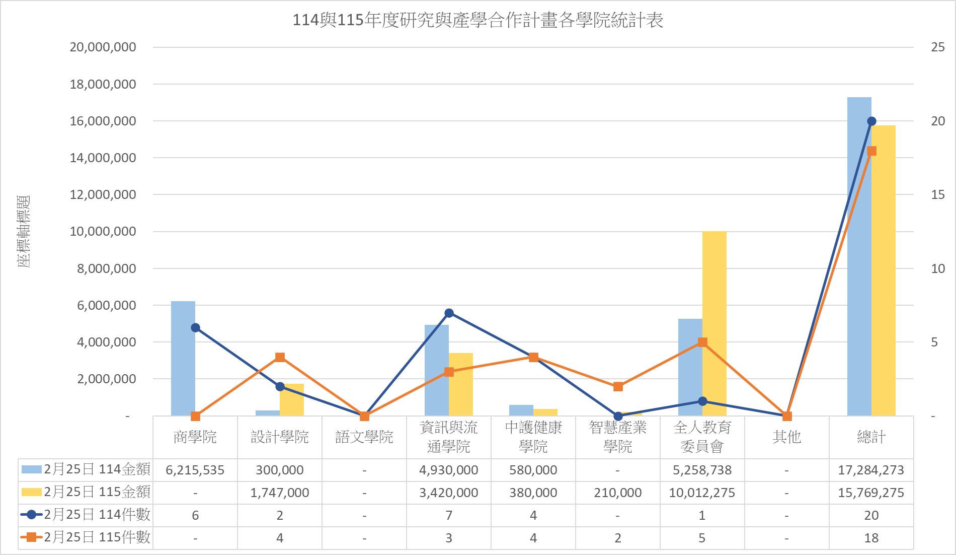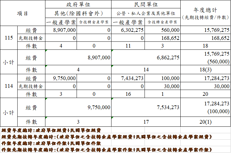 本校115年度研究及產學合作計畫(截至115/2/25止)共計18件,總經費新台幣(下同)15,769,275元整,含(先期)技術移轉3件,金額$560,000元整; 114年度同期研究及產學合作計畫(截至114/2/25止)共計20件,總經費新台幣(下同)17,284,2739元整,含(先期)技術移轉1件,金額$100,000元整。