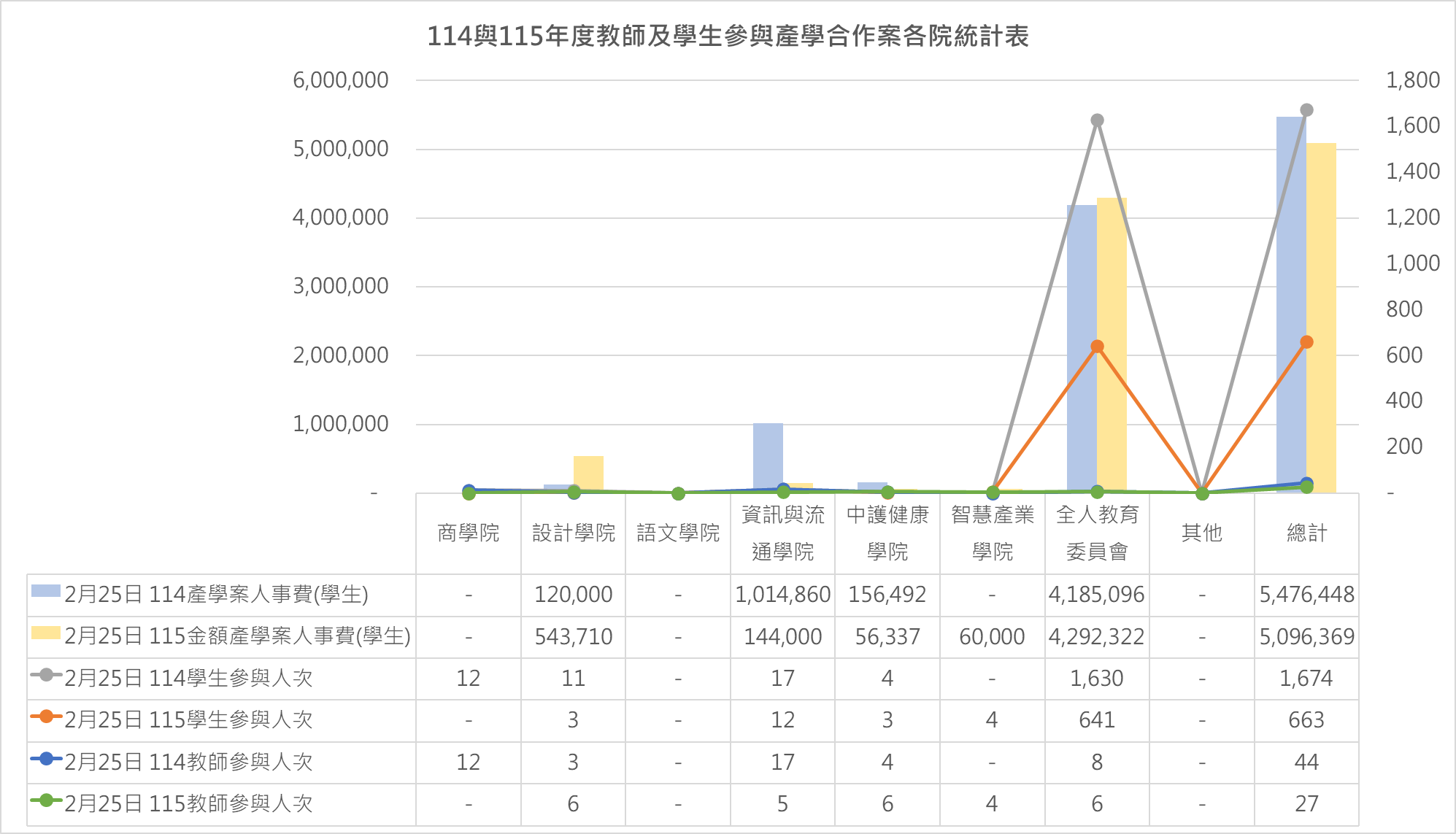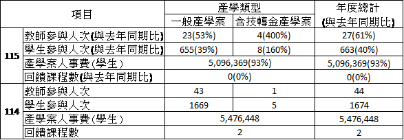 115年度教師及學生參與產學合作案參與人次、聘任學生經費及回饋課程數(截至115/2/25止) ,參與之情形如下表所示: