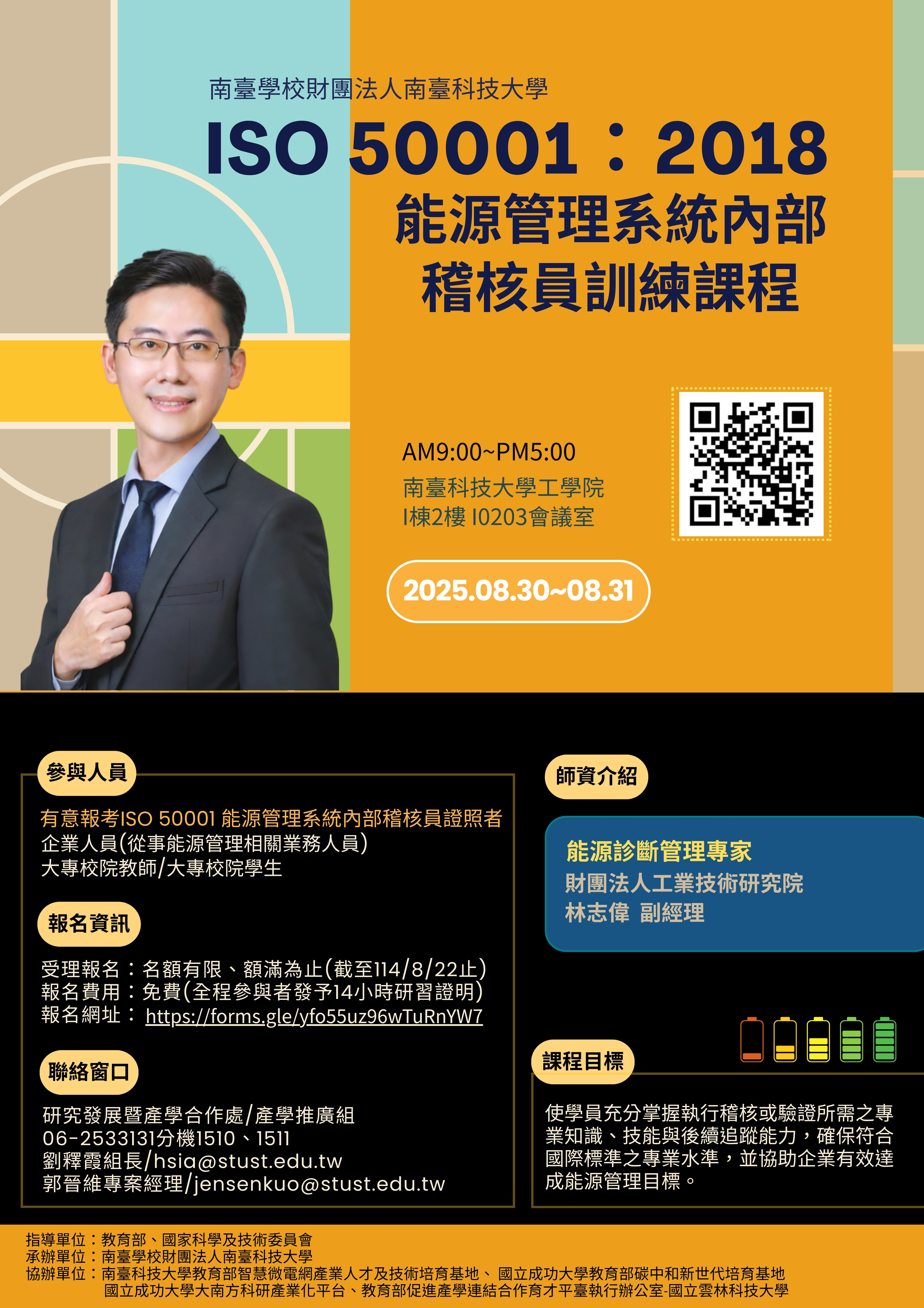 有關國立雲林科技大學推動教育部育才平臺任務四提升教師實務增能, 協助辦理南臺科技大學2025「ISO 50001:2018 能源管理 系統內部稽核員訓練課程」,敬邀貴校教師參與並請協助公告。
